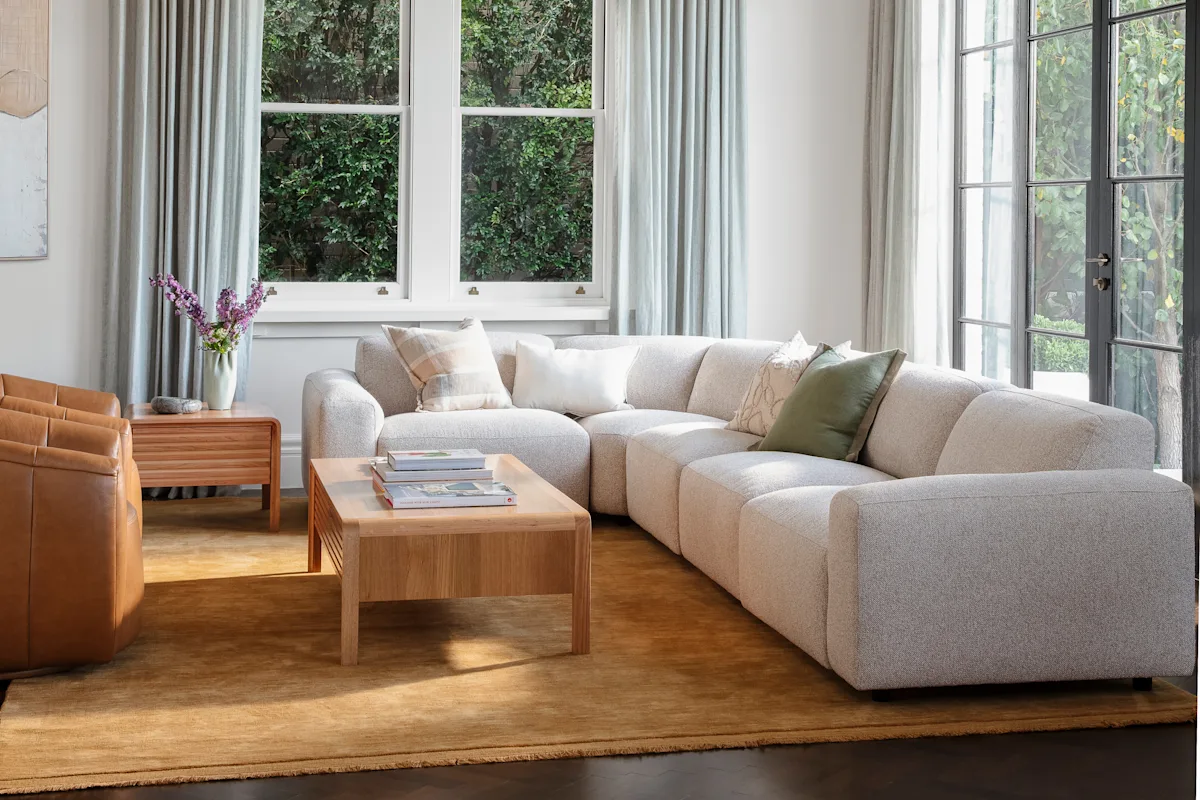 A light, open palette of beige and grey sets a calm foundation for this living space. Warm timber finishes and earthy tones of burnt orange and brown are softened with hints of green, bringing warmth and ease to a look that feels relaxed, inviting and full of light.