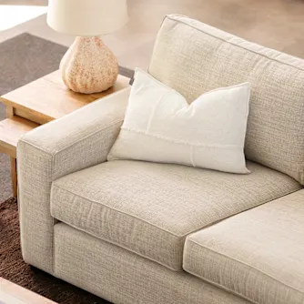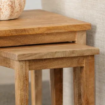 This soft modern farmhouse look blends clean silhouettes with warm neutrals and natural materials. Beige tones and rustic oak bring lightness, balanced with touches of brown and greenery to create a living space that feels calm, welcoming and easy to live with.